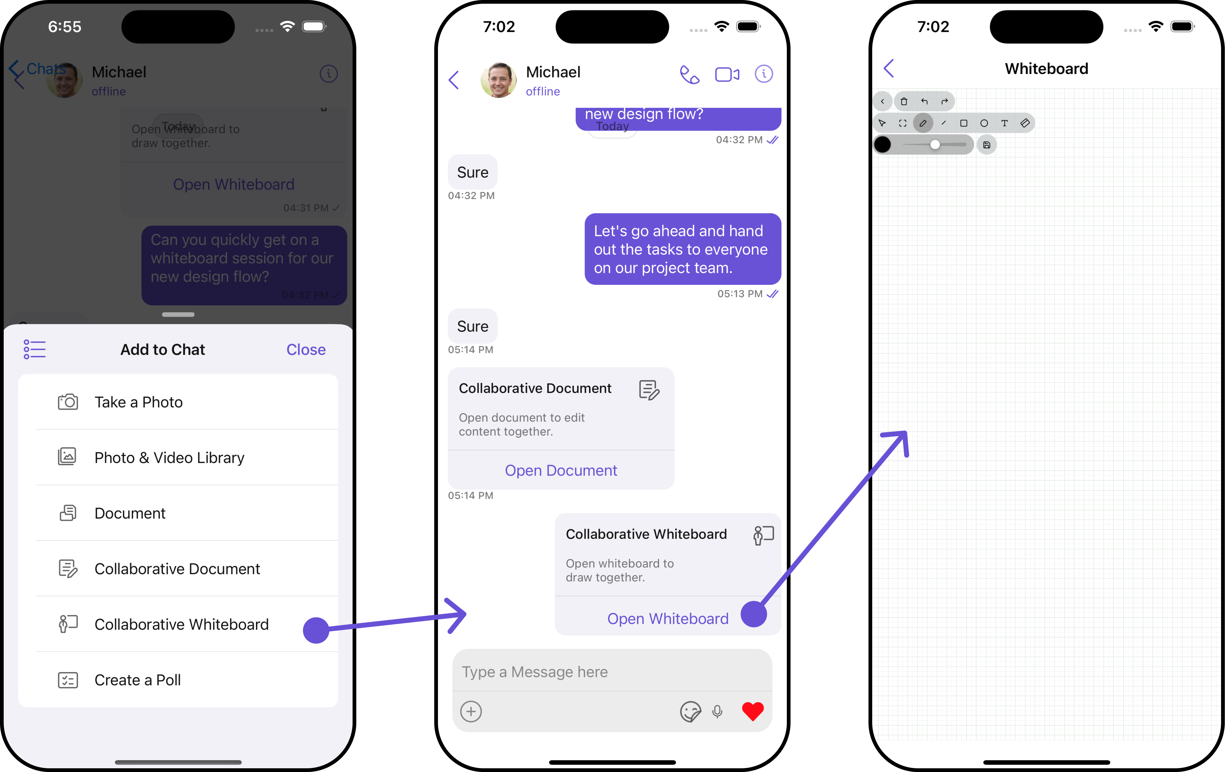 The Collaborative Whiteboard extension facilitates real-time collaboration. Users can draw, brainstorm, and share ideas on a shared digital whiteboard. For a comprehensive understanding and guide on implementing and using the Collaborative Whiteboard Extension, refer to our specific guide on the Collaborative Whiteboard Extension. Once you have successfully activated the Collaborative Whiteboard Extension from your CometChat Dashboard, the feature will automatically be incorporated into the Action Sheet of the Message Composer component of UI Kits.